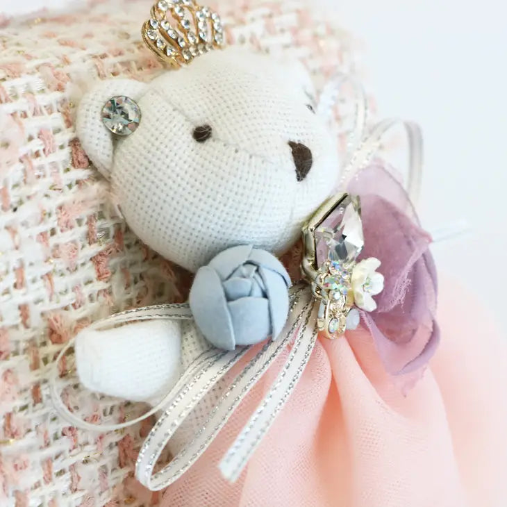 Spoil them with this classic 'Lady Vie' purse. Beautifully crafted in tweed material, embellished with Lady Vie bear in a dress and tiara, and comes with a detachable pearl handle and gold chain. Wear her as a handbag or a cross-body bag and coordinate with anything and everything your little fashionista fancy.